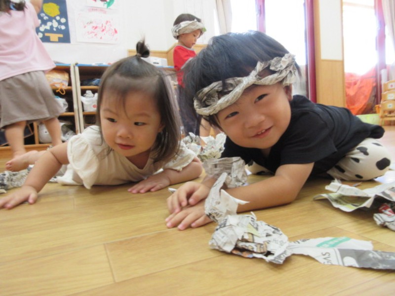 2025.09.19 あひる組今日は、お部屋で新聞遊びをしました。 大きな一枚の新聞紙を細かく破ったり、保育者が作ったメガネを 付..