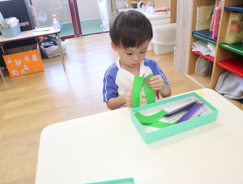 2025.09.22 くま組折り目の付いた折り紙を鋏で切りました。 真っ直ぐ切ろうと真剣な眼差しの子ども達が切り終えると 「先生..