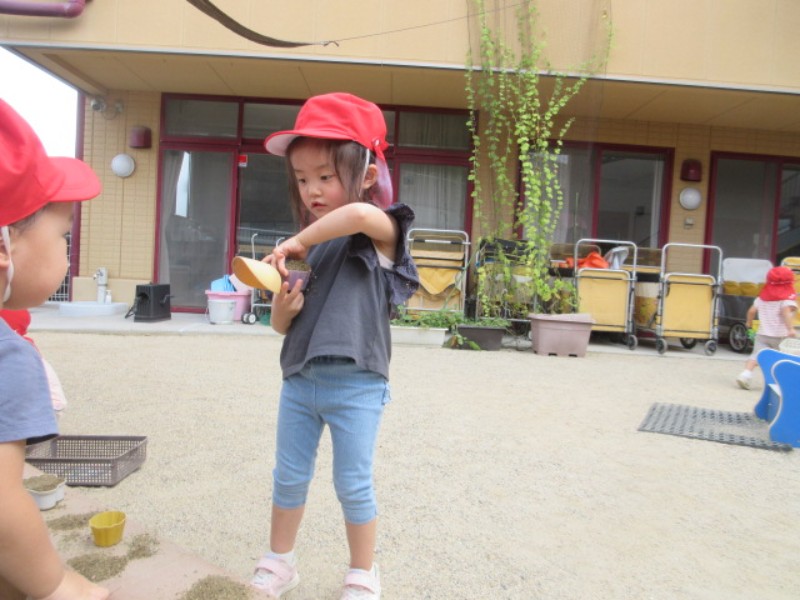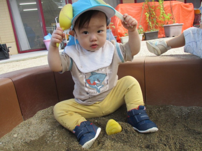 2025.09.22 りす組今日は、園庭で砂遊びをしました。 保育者が型抜きで蟹やお魚を作ると崩す事を楽しんだり、他の型を手に取..