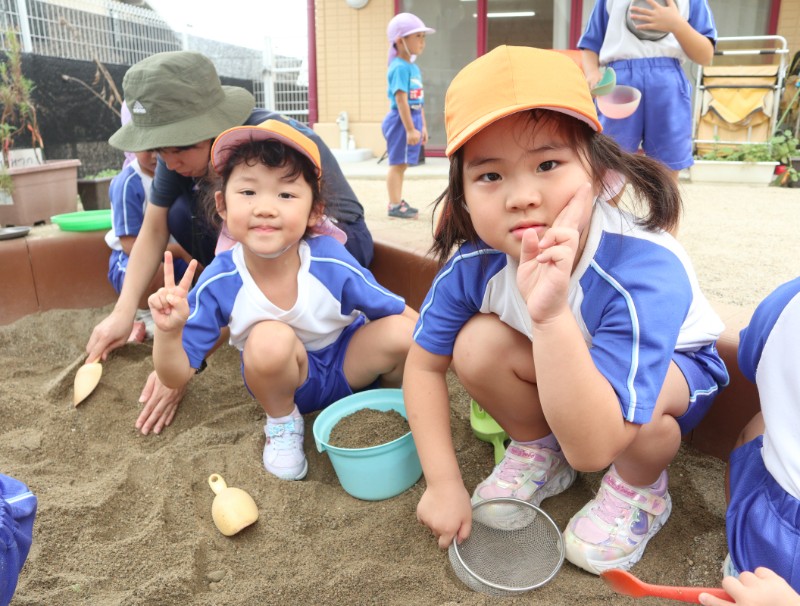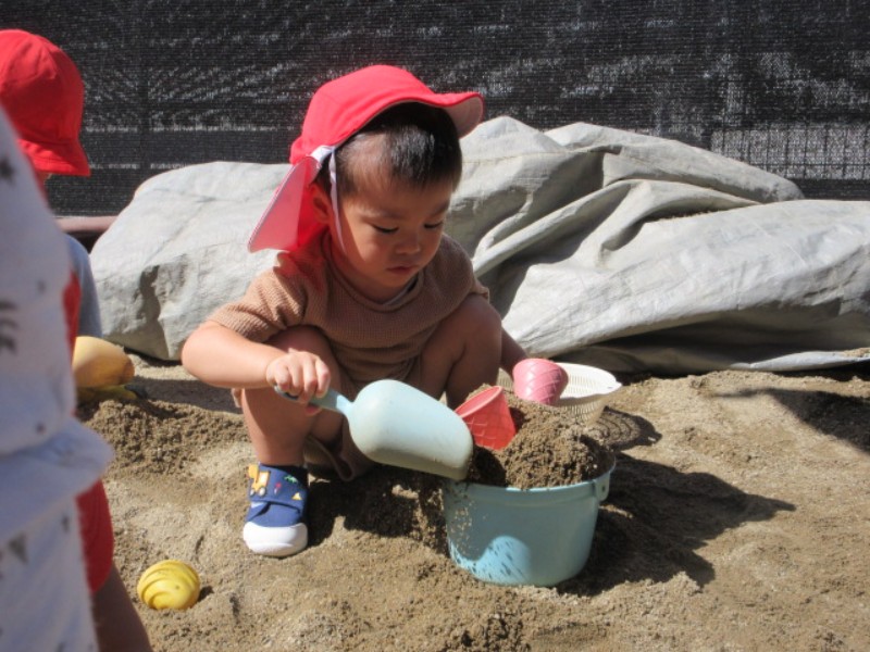 2025.09.26 りす組今日は、園庭で砂遊びをしました。 お友達と協力して大きいお山を作ると、保育者に「見て、大きいのできた..