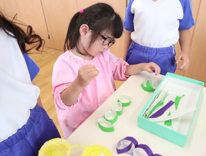2025.09.24 くま組以前切った折り紙を使ってぶどうを作りました。 糊を付け、輪っかを作り「これを沢山繋げていくの?」と ..