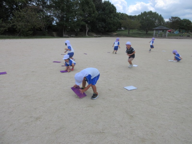 2025.09.26 うさぎ組一里山公園に行き、グラウンドでカードめくりをしました。 素早くカードをめくり、相手チームに勝とうと奮..