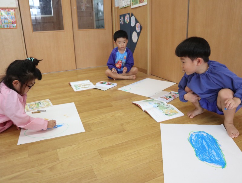 2025.09.29 くま組9月の月刊絵本を見ながら絵を描きました。 どの様な絵なのか、特徴を捉えながら集中して 描く事が出来て..