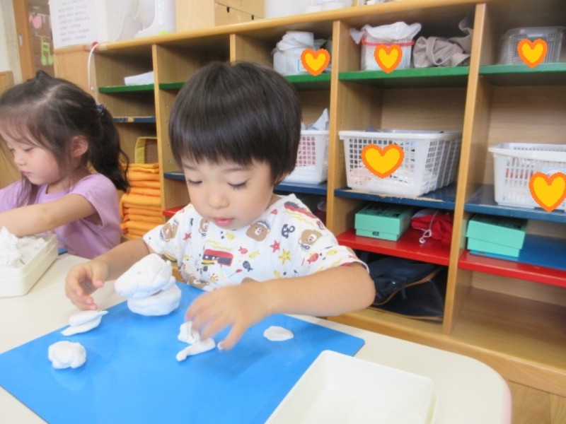 2025.09.24 りす組今日は、粘土遊びをしました。 「ライオン、ゾウ、カエル」とお話しながら自分の好きな物を作ったり 「見..