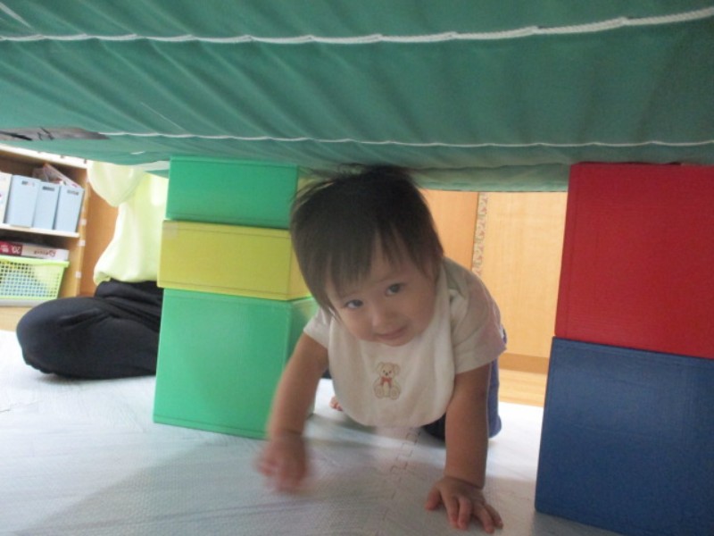 2025.09.29 ひよこ組今日は、室内でマット遊びを楽しみました。 ブロックとマットでトンネルを作ると潜る事を 楽しみ「ばあ」..